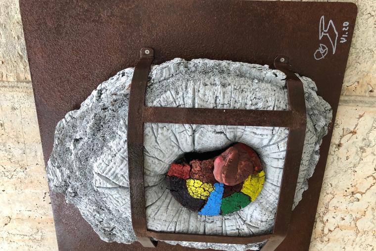 Martí Boada sees art as a mean to, among others, incite and lead to social change. The situation of confinement caused by the covid-19, inspired him to create the work "Forest Art: Cerebral Confinement in Douglas". It is a metaphor for the confinement of thought. The work is set on a conifer representing the brain, and in the center, painted with the colors of the Rainbow, the hopeful thought. This is covered by a steel structure that symbolizes the anomalous and unwanted containment caused by the current crisis and the uncertainty that it entails.