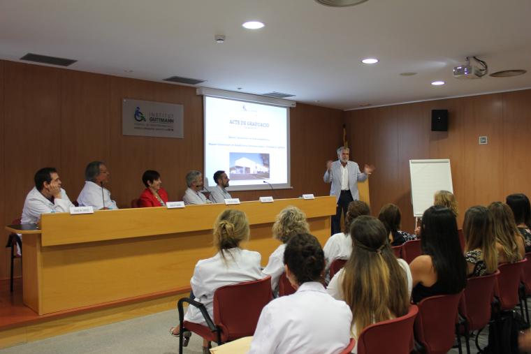 Students, professors, relatives and friends filled the Guttmann Institute Audit Room at the graduation ceremony of the Neurorehabilitation and Neuropsychological Rehabilitation Masters of the University Institute of Neurorehabilitation.